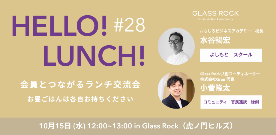 Glass Rock 〜 Social Action Community 〜 は企業・行政機関・NPO・市民等が領域を超えて社会課題解決を目指す共創コミュニティ💫「気になってはいるけれど、現地を訪れるきっかけがほしい」 。そんな声にお応えするかたちで、 気軽にご参加いただけるカジュアルなランチ会を企画いたしました。