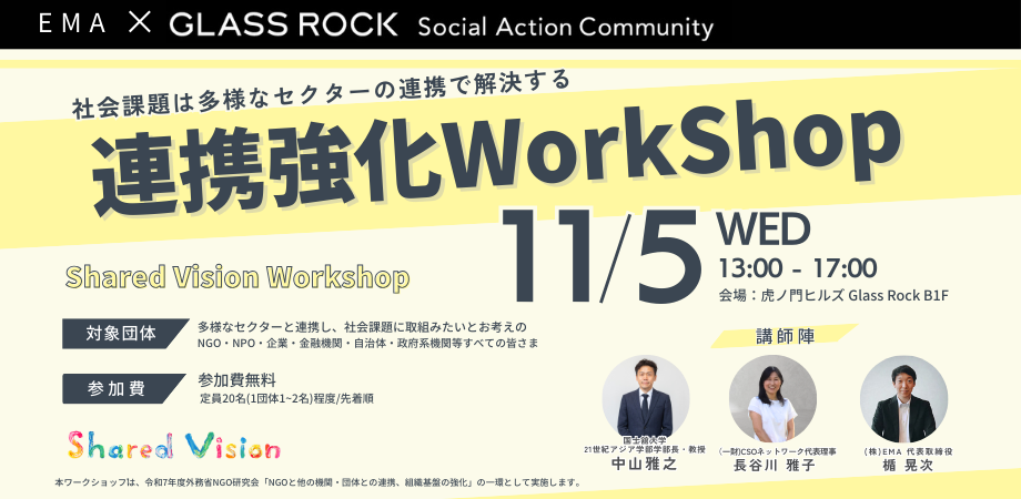 本ワークショップは、複雑化・構造化する社会課題に対して、立場を超えて目的を共有(Shared Vision)することでつながり、新たな協働の芽を育むことを体験しながら学ぶプログラムとなります。外務省令和7年度NGO研究会「NGOと他の機関・団体との連携、組織基盤の強化」の一環として開催されるものであり、共創パートナーの株式会社EMAよりGlass Rockメンバー向けのご案内をいただきました。ぜひご参加ください。