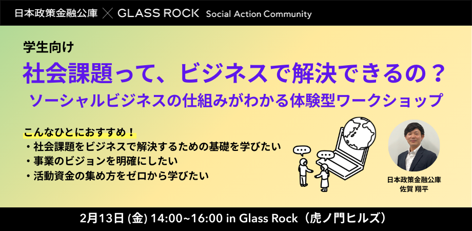 今回は、Glass Rockの共創パートナーである日本政策金融公庫さんと一緒に、「社会課題って、ビジネスで解決できるの?」という問いを入り口に、ソーシャルビジネスの基本的な仕組みを体験的に学ぶワークショップを行います。 ワークショップでは、社会課題への関心や想いを言語化してみます。その上で、どのようにビジネスとしてできそうかを考え、事業として活動していくためのお金の仕組みに触れていきます。