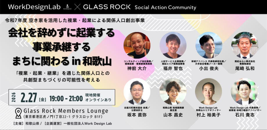 和歌山県と一般社団法人Work Design Labが連携して「地域課題解決・まちづくりと新しい働き方(複業・起業・継業)を考える」をテーマにしたイベントを開催します。