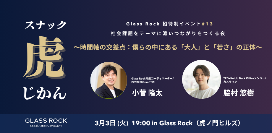 今回は、「大人って何?若さって何?」という問いを通じて、世代や立場を超えた対話の場を開きます。この夜をナビゲートしてくれるのは、Glass Rock において「年齢」という数字を超えた本質的な問いを探求し続けるお二方です。