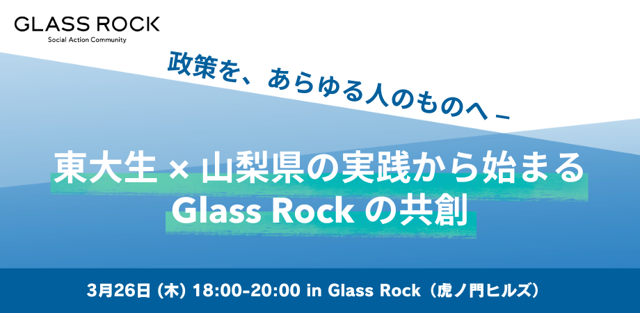 今回の東大と山梨県の取り組みは「政策とビジネスの交差点」で社会の仕組みを設計する原型となるものです。Glass Rockでは、社会課題を起点に事業をつくり、ビジネスを通じた社会のアップデートを目指していますが、その際に必須なのが「政策×ビジネス」の視点です。