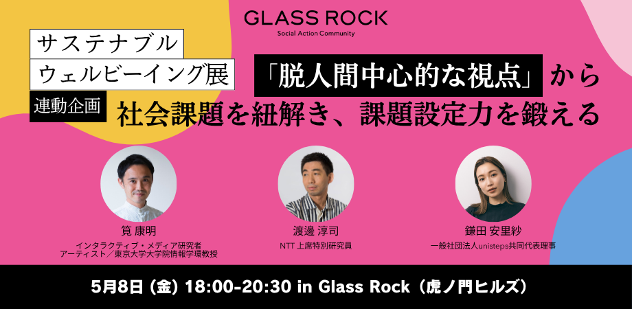 今回、Glass Rock Galleryで現在開催されている「サステナブル ウェルビーイング展 More-than-Humanの視点から」の連動企画として、人間以外の視点から社会課題を捉えることが、課題設定力を鍛えるヒントとなることを体感するイベントを開催します。